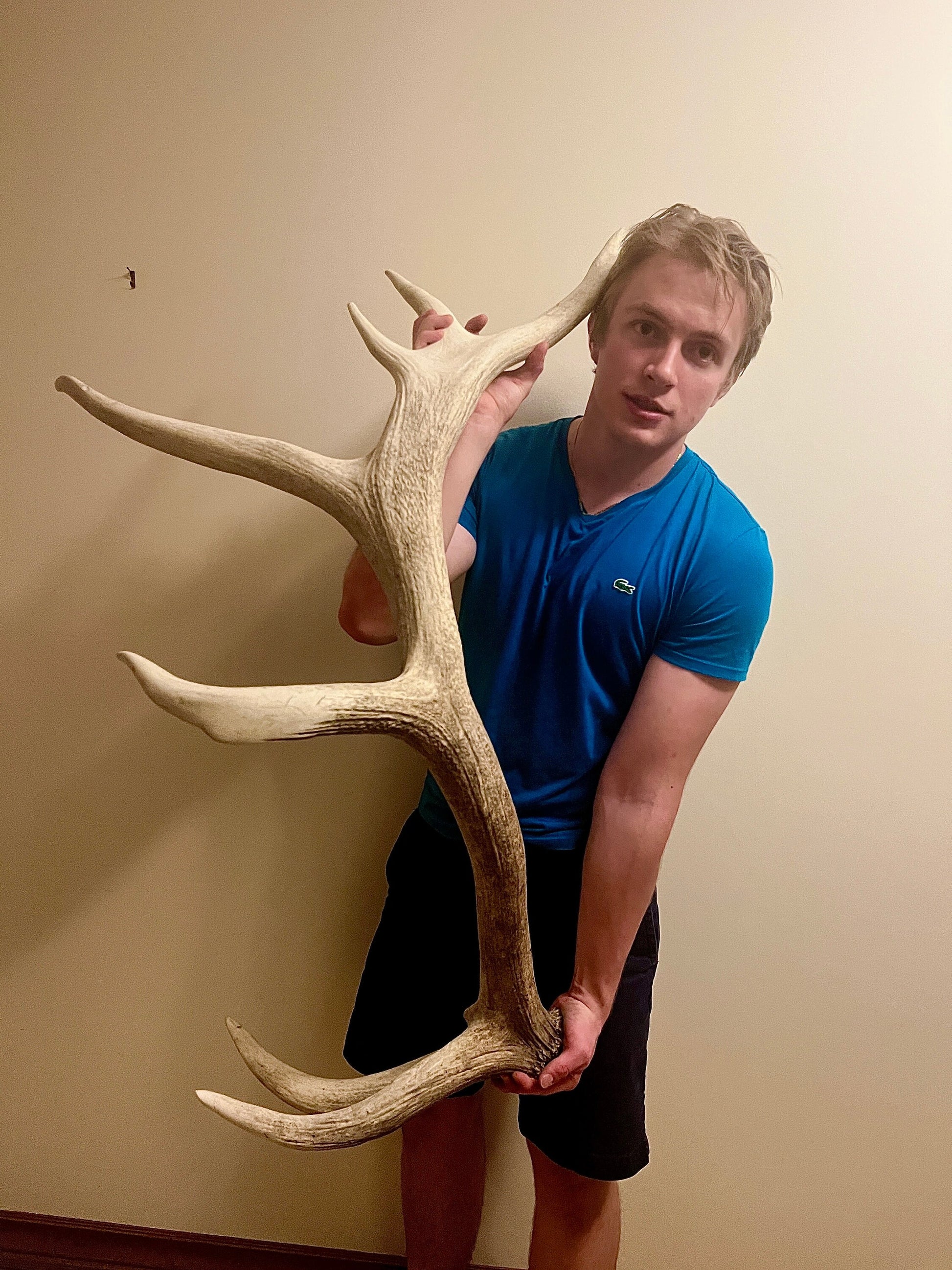 This antler is unbelievably thick. the base is much thicker than a wine bottle. The small antler in some images is a regular (large) 5 point whitetail deer antler.